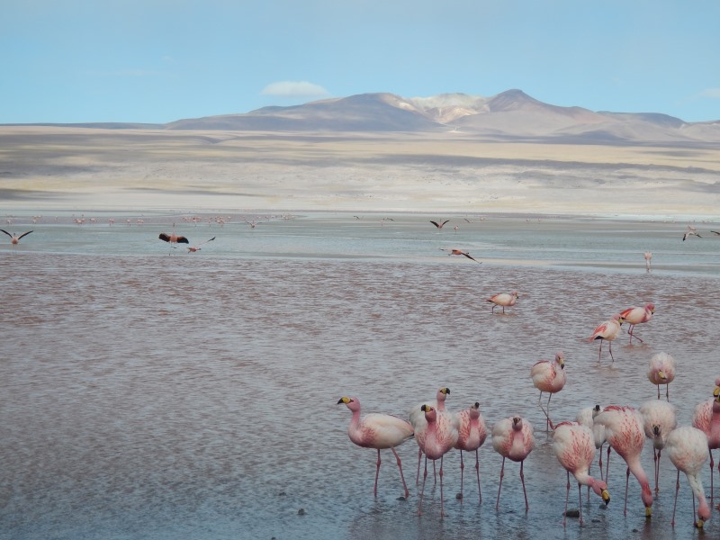 Das Hauptziel war die Salzwüste (Salar de Uyuni). Auf dem Weg dort hin haben wir viele schöne Gebirgs-Lagunen besichtigt. Durch die Mineral- und Algenanlagerungen haben sie alle verschiedene prägnante Farben.