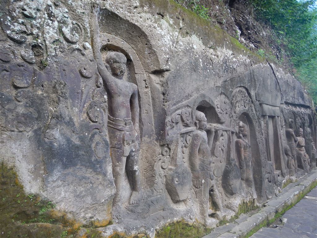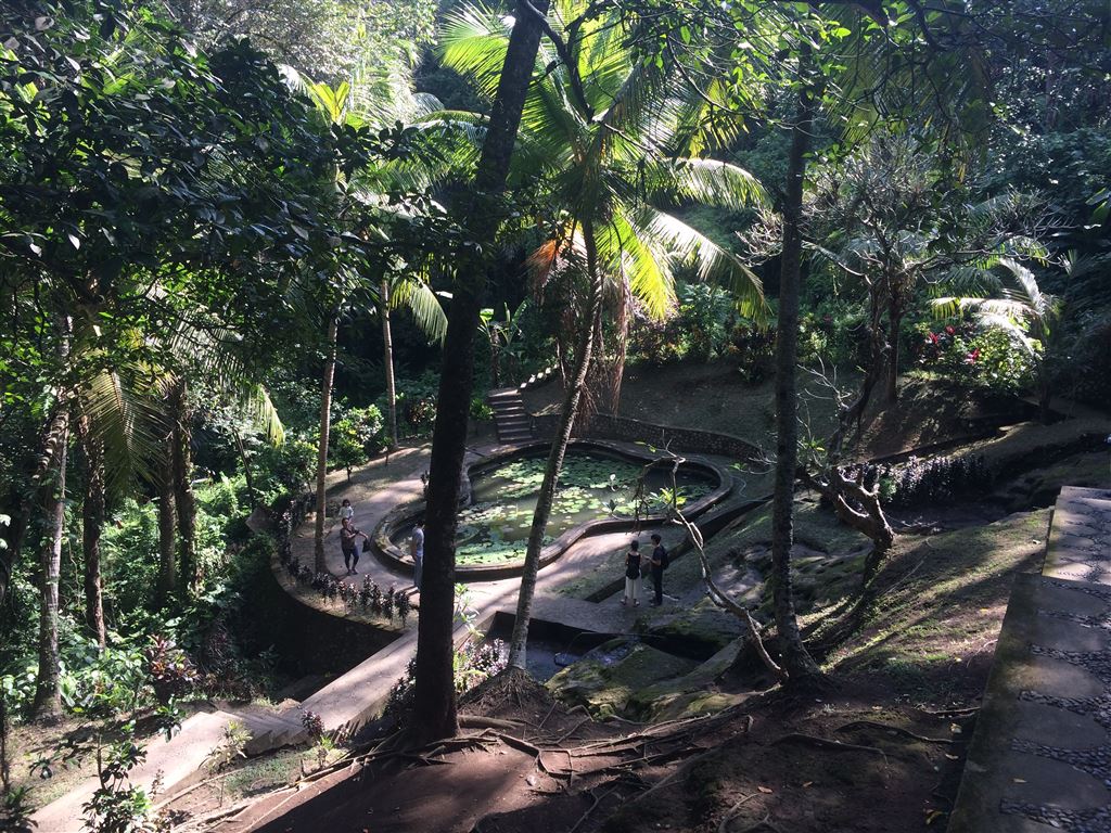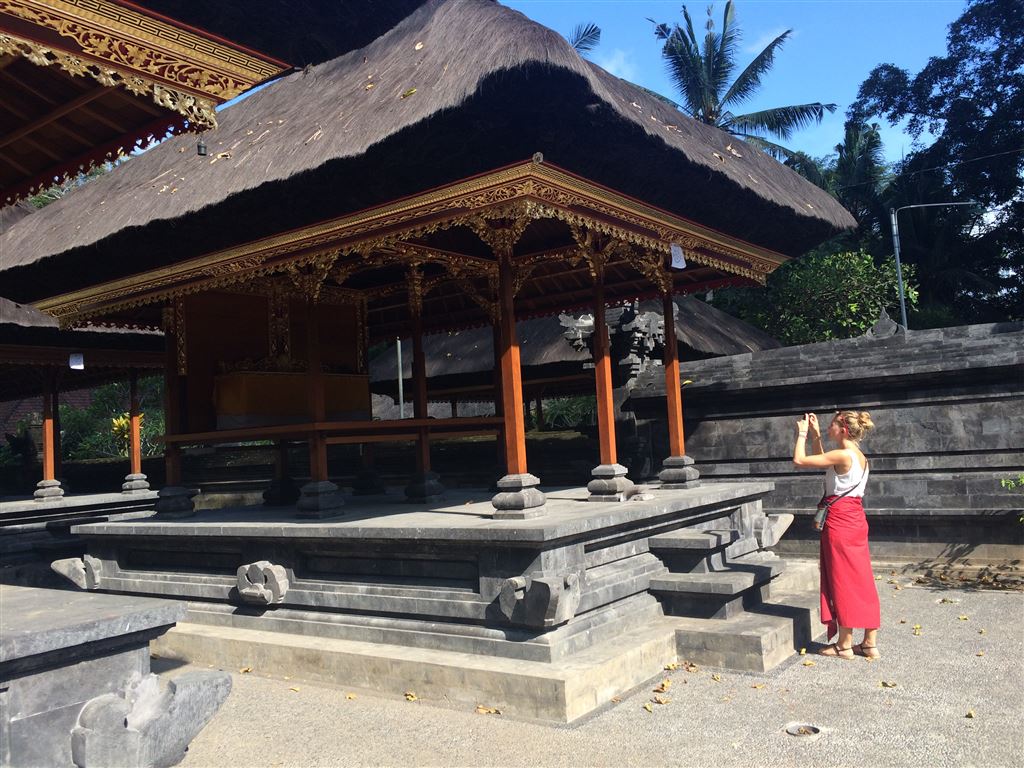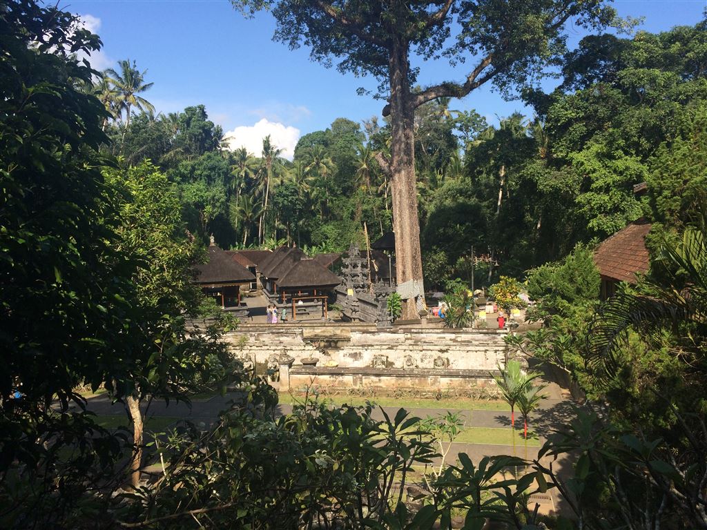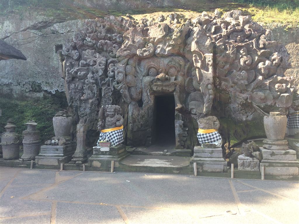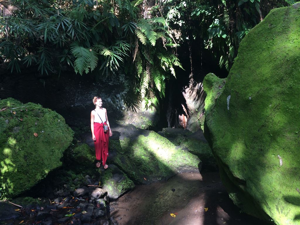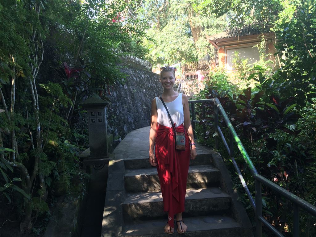 Am nächsten Tag zogen wir um in ein anderes Hotel weiter nördlich von Denpasar. Unser erstes Ziel von dort aus war die Höhle Goa Gajah. Natürlich hatten wir wieder einen Chauffeur, der uns für ein paar Euro hinfuhr (bei über einer Stunde Fahrt). Es war hier übrigens nicht erlaubt zu viel nackte Haut zu zeigen, deshalb mussten wir ein Tuch um unsere Beine wickeln: