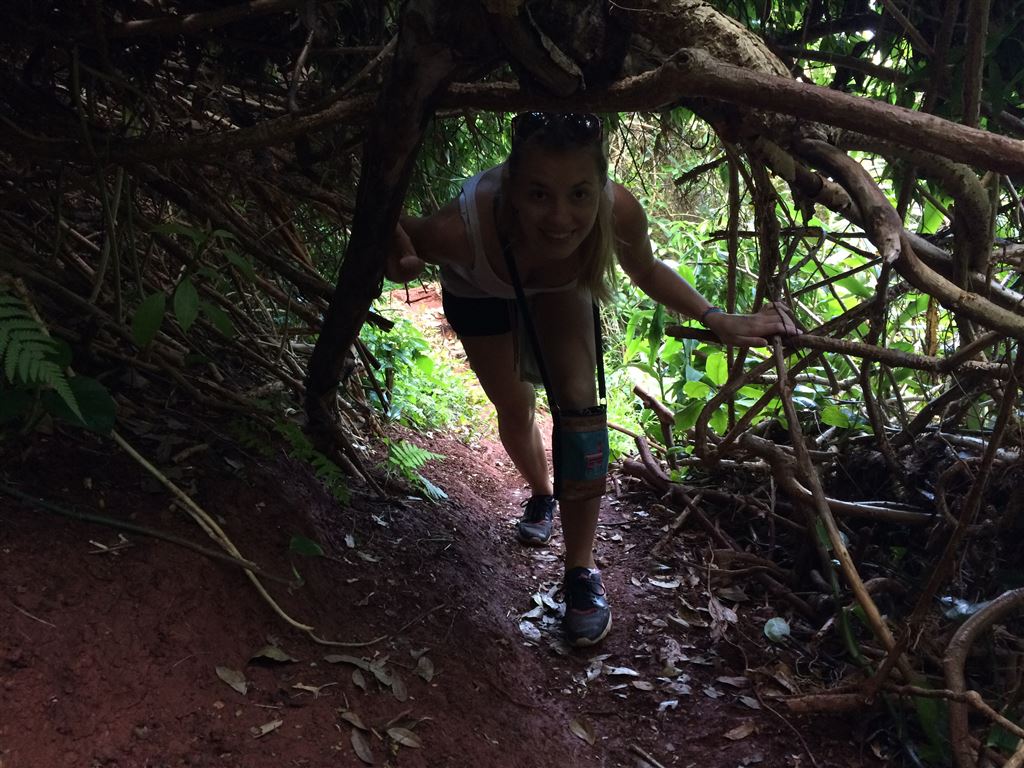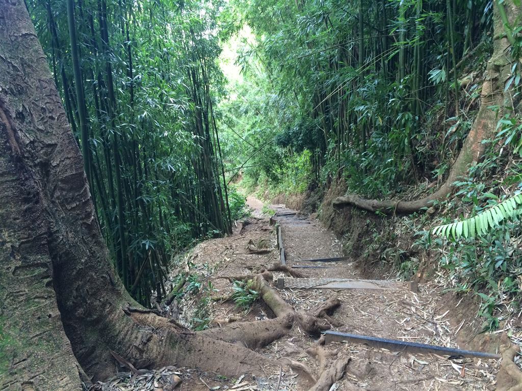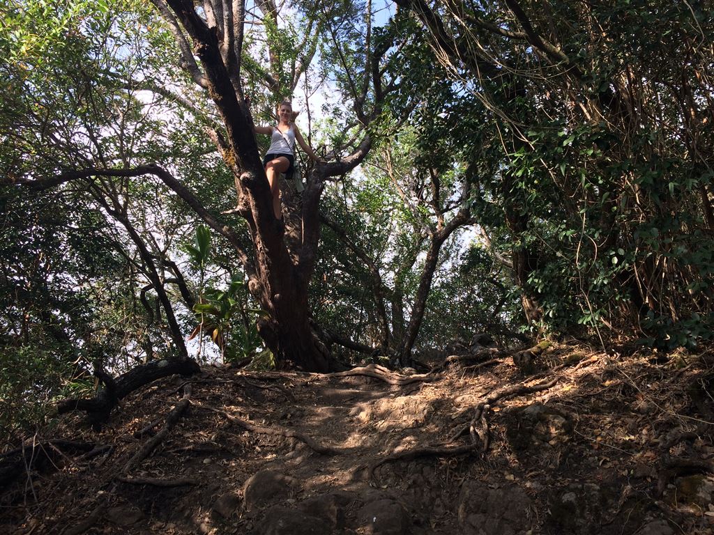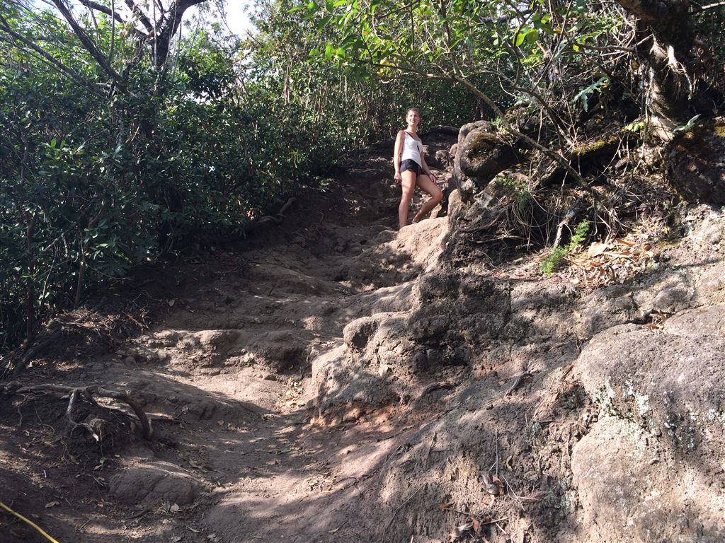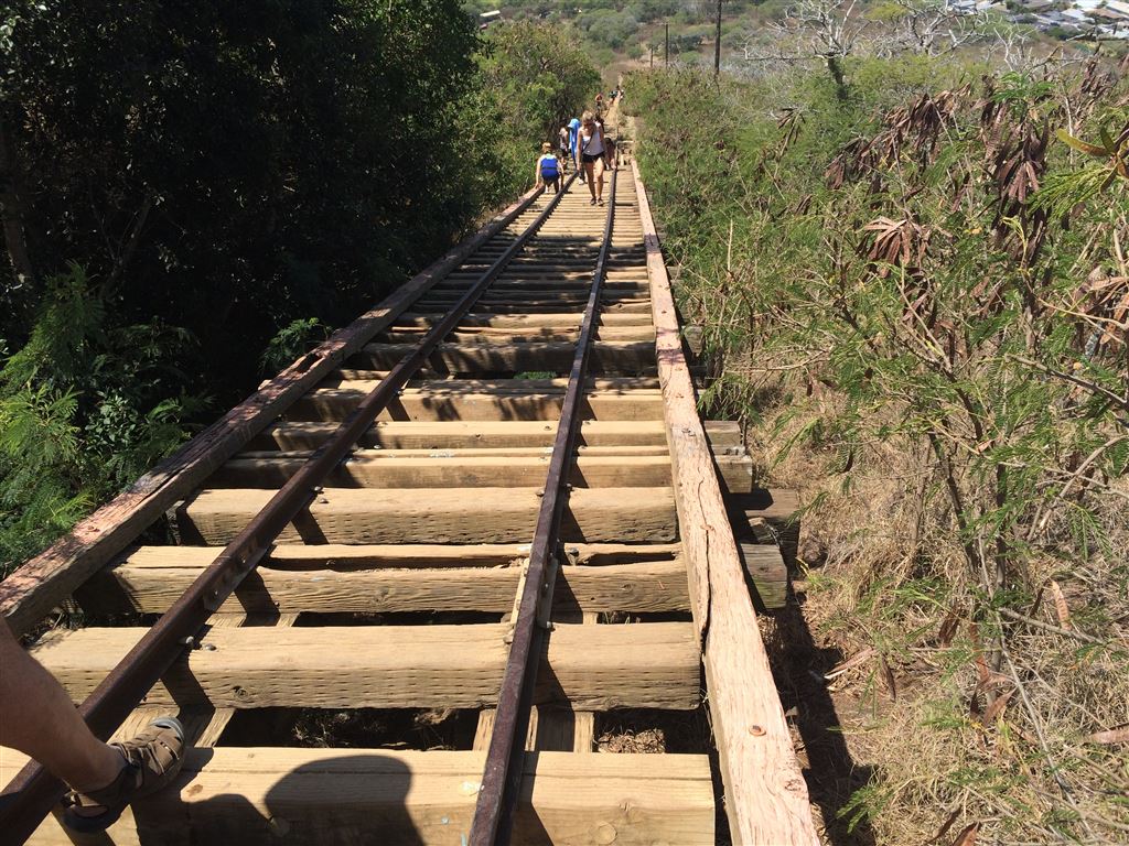Am nächsten Tag hatten wir einen wahrlichen Wander-Marathon vor uns. Da wir insgesamt wenig Zeit für Hawaii hatten, wir aber so viele schöne Wanderungen fanden, versuchten wir 3 Wanderungen an einem Tag unterzubringen. Unsere erste Wanderung ging über ultra steile Bahnschienen einen Berg hoch. Der erste Anblick war eher mäßig motivierend 😉