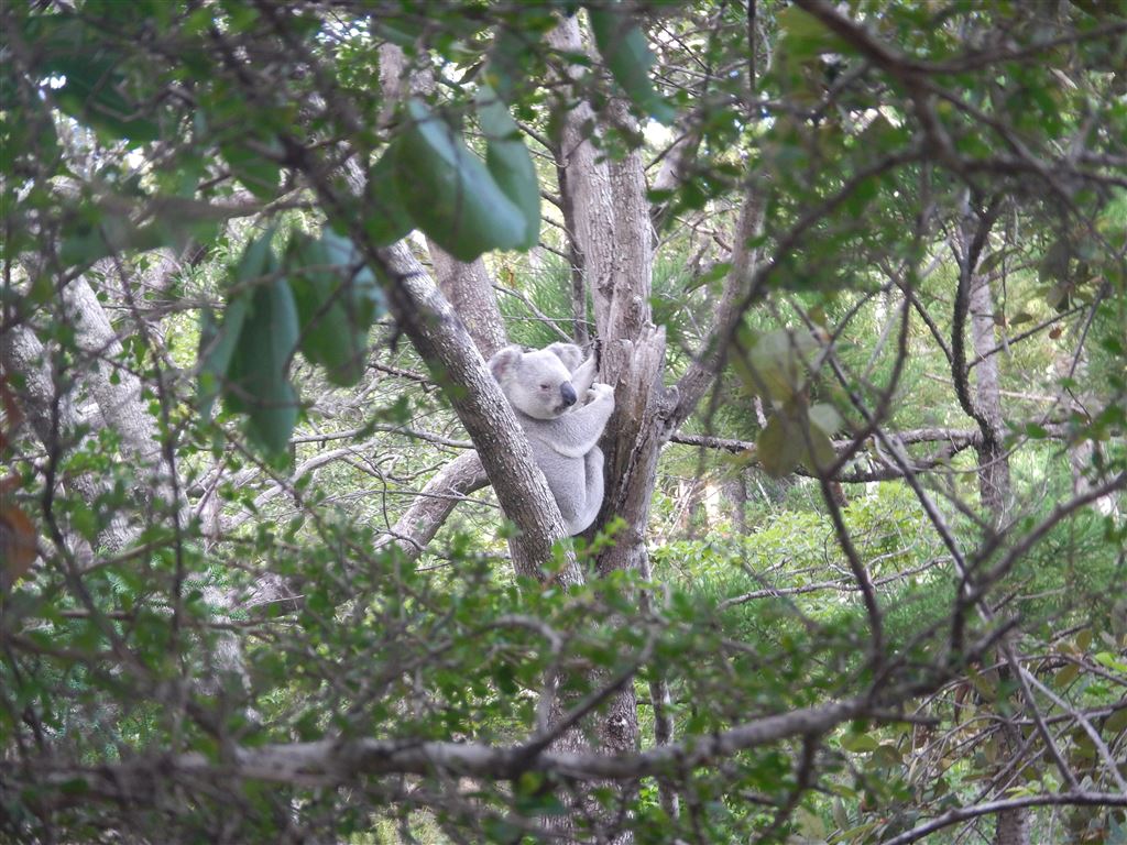 Bei diesem Pfad ist es eine Art Brauch immer bei der Entdeckung eines Koalas eine kleine Markierung in Form eines durch Ästchen geformten Pfeils am Boden anzubringen. Das hat uns unser Gastgeber vor der Wanderung schon verraten. Deswegen haben wir immer aufmerksam nach Pfeilähnlichen Ästchen gesucht. Wir haben auch ein zwei Pfeile gefunden und dadurch Koalas in weiterer Entfernung entdeckt. Aber unseren Besten Fund entdeckte Maren. Ziemlich tief am Baum saß ein schlafender Koala (Koalas schlafen ca. 20Stunden am Tag). Das ermöglichte es uns sehr nah an den Koala ranzukommen und Fotos zu schießen: