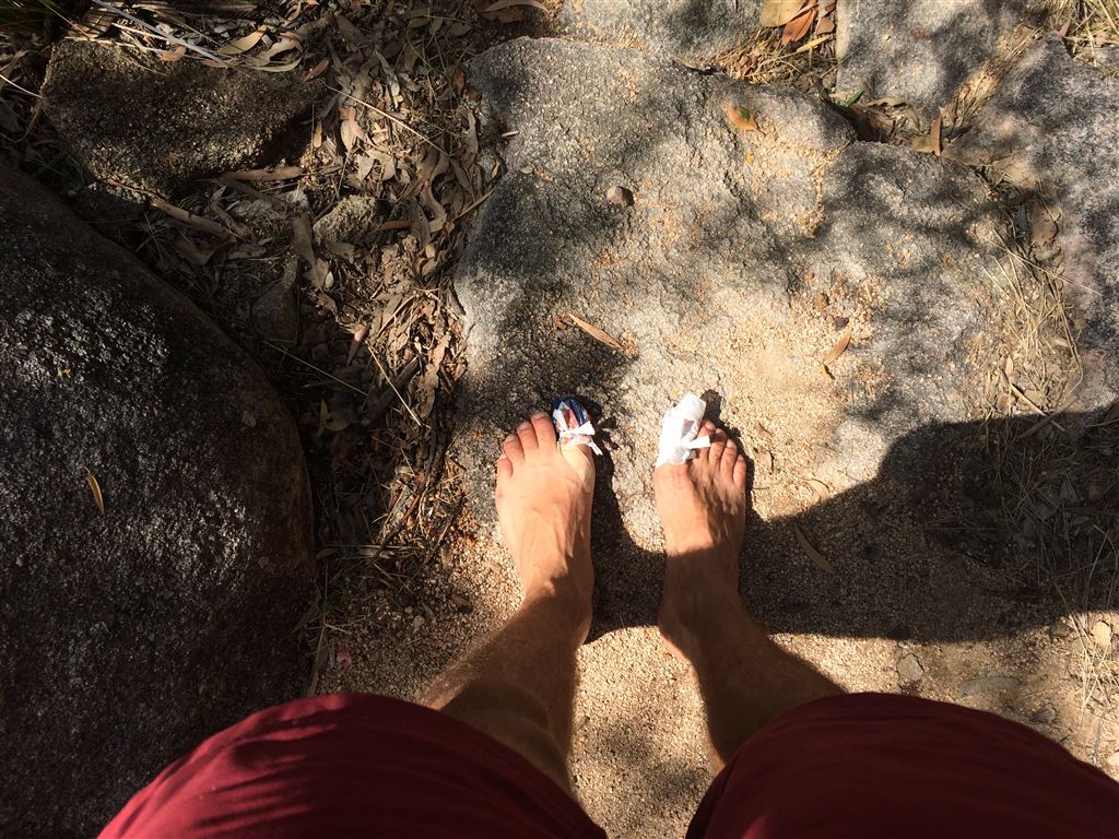 Ich hatte mich übrigens entschlossen mit FlipFlops wandern zu gehen, was ich sehr schnell bereute. Meine so schon von Whitsunday (siehe Beitrag) ramponierten Füße, bekamen Blasen durch das reiben an den Flip Flops, deswegen musste ich irgendwann Barfuß weiterlaufen. Dadurch kamen zur Verletzung vom Whithaven Beach und den Blasen auch noch kleinere Schrammen durch das Barfußlaufen auf den steinigen Wegen dazu. Meine Füße sahen wirklich ziemlich mitgenommen aus:D