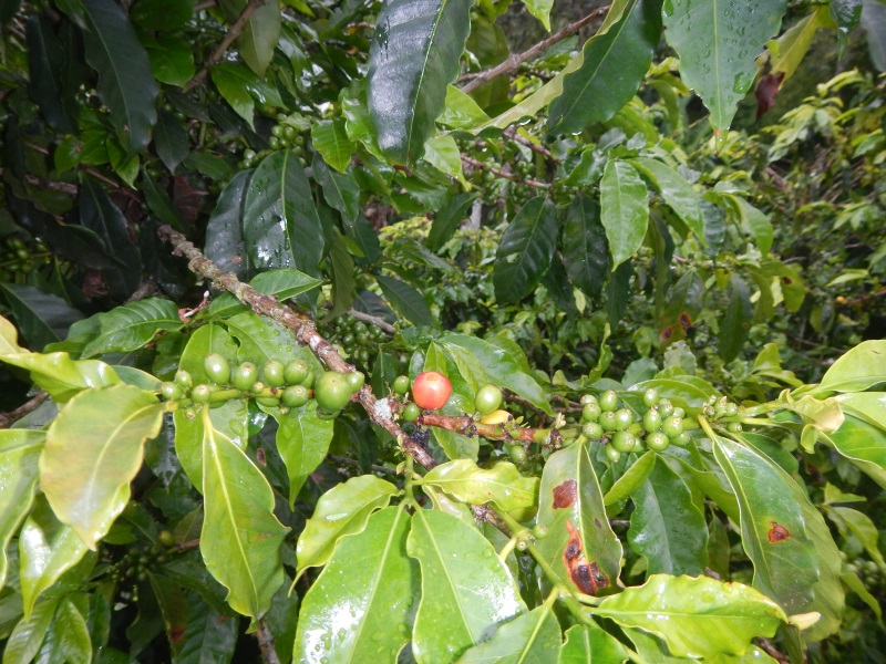 Die Kaffeebohnen wachsen hier an Sträuchen und müssen geernet werden (nur die roten sind reif):